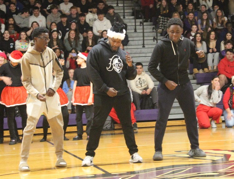 After the cheer team captivated the audience, teachers from the main building and GNC joined students to perform holiday and TikTok-inspired dances together. “We were asked to perform by Chelsey Duah,” shared math teacher Lori Obdyke. “[Chelsea] then ran the practices and choreographed all the dances.”