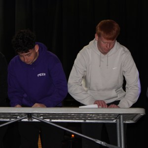 The assembly began with a performance by faculty band, Log on a Bench, featuring Scott Beverly, Robert Cotugno, James Oliveri, Stephen Pasqua and Richard Torok. “They played good,” said Matthew Walz.