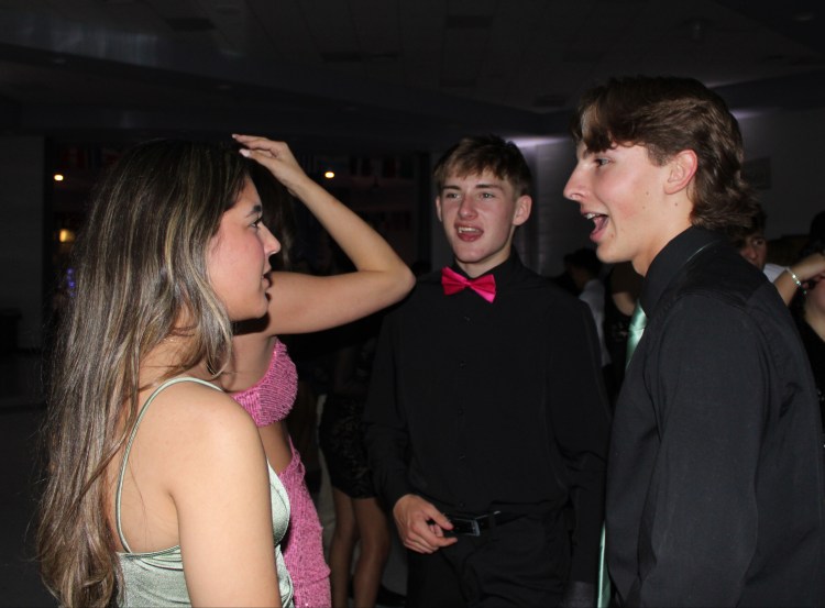 Gabriella Dettloff, Kyle Hughes, and Christian Cavanagh talk during the Homecoming dance.