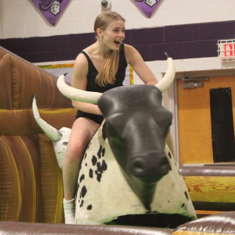 Junior Noah Balbuena shifts his weight to balance on the mechanical bull in the main gym.