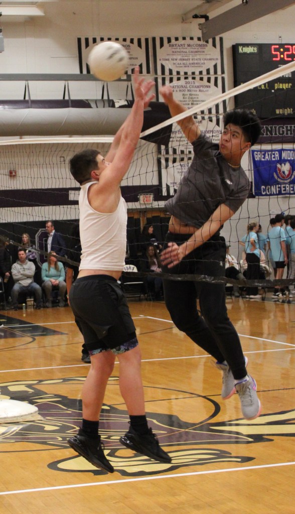 Ashley Markle and senior teammate Abigail Jazmin, who finished second on the team with 22 blocks, rise up at the net to block a shot by an opposing player.