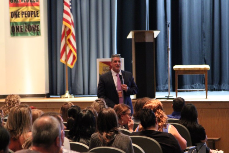 Dr. Sasso addresses faculty in the auditorium during the staff-in-service day.