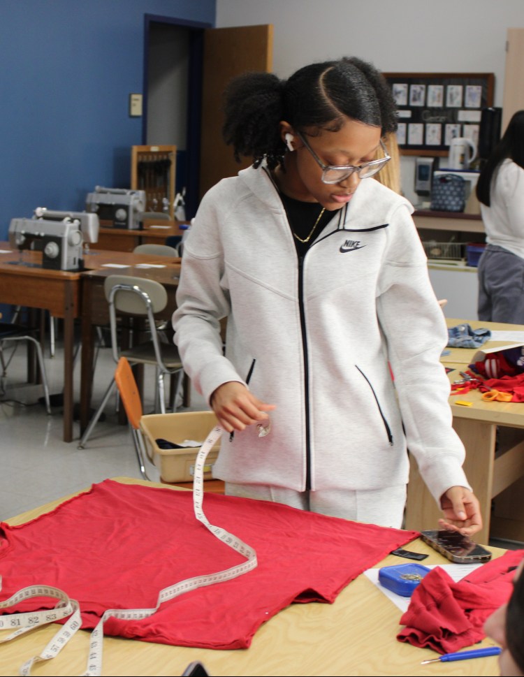 Clothing & Design II student Sade Ferguson measures her material as she works on her sustainable outfit.