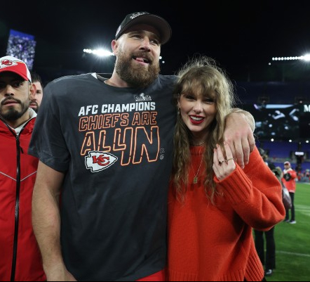 Travis Kelce and Taylor Swift celebrate his AFC Championship win over the Baltimore Ravens together.